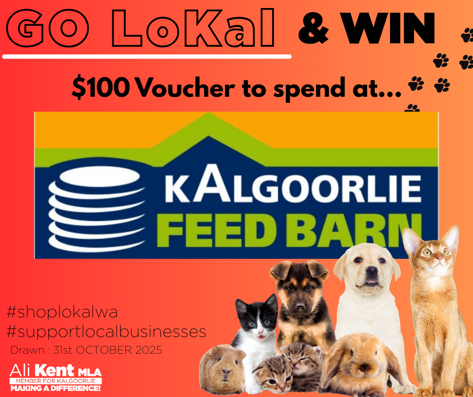 Our OCTOBER Raffle is for those who love their FURBABIES with $100 for Kalgoorlie Feed Barn! Kalgoorlie Feed Barn stocks quality bulk animal feed and animal health care products and accessories in a convenient drive through location. Locally owned and operated, Kalgoorlie Feed barn is your one stop stock feed shop in the Goldfields and surrounding areas.